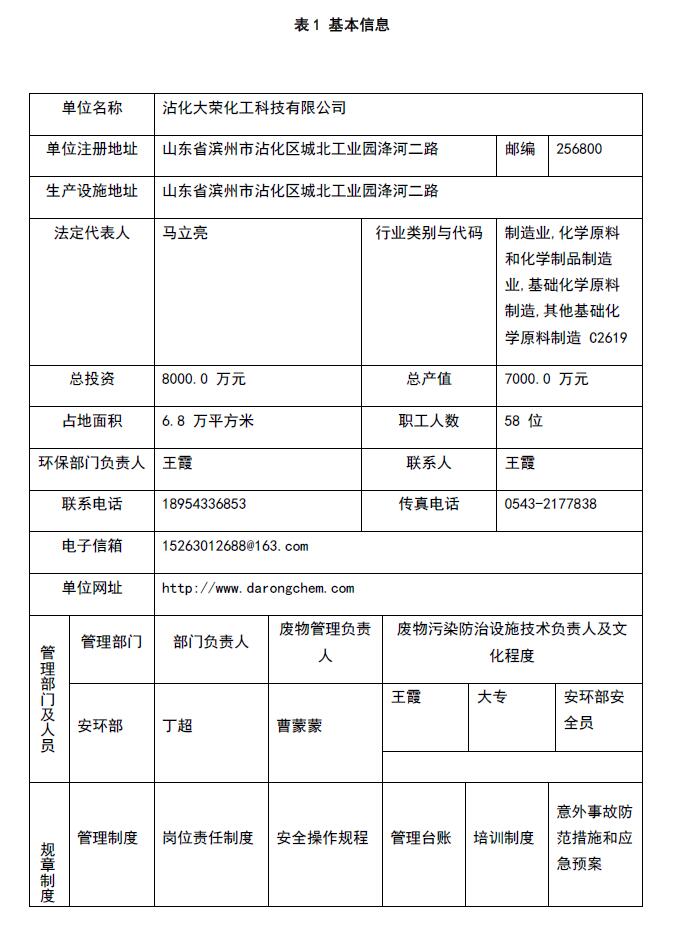 單位名稱(蓋章):沾化大榮化工科技有限公司