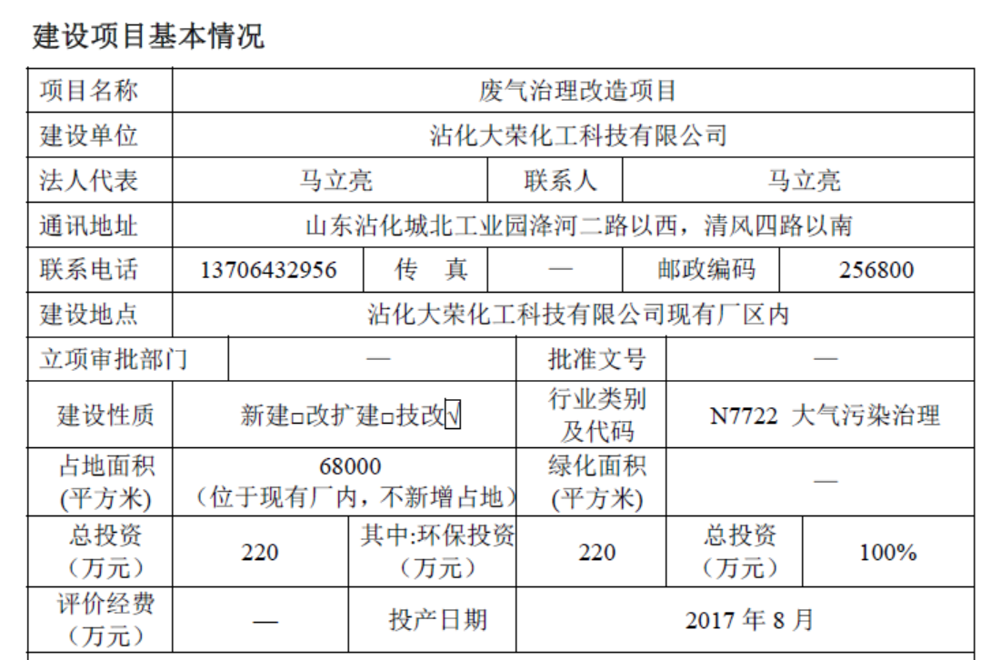 放廢氣進(jìn)行綜合整治,投資220 萬建設(shè)沾化大榮化工科技有限公司廢氣治理改造項(xiàng)目。